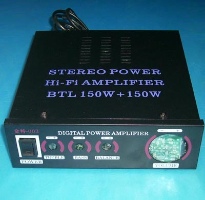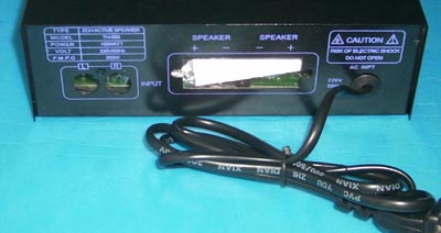 工作电压: AC220V 锋值功率: 150W*2 前面板: 有左右声道、音量、高音、低音控制,电源开关,指示灯 后面板: 喇叭输出端子是线夹,信号输入端是莲花插座,电源线
