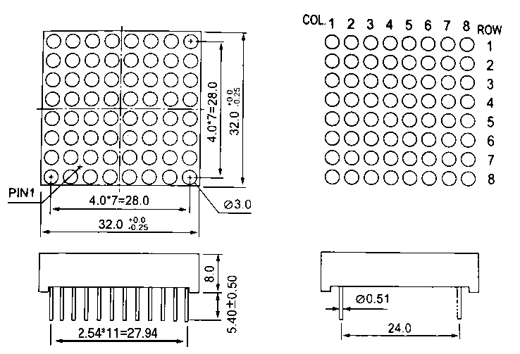 在为点阵价格高而苦恼吗?现在只要一顿快餐的钱就可以动手制作属于自己的LED点阵显示屏。 此款点阵是本站回收的库存点阵之一,为回馈五一电子的新老客户,特意以超低价格销售这批点阵。好的东西不一定都很贵;8*8单色点阵,我们只卖1元一个。用物超所值来形容是再恰当不过的了!需要的话可以随时联系我们!别忘了把这个好消息告诉和你同样爱好电子的的亲朋好友。 点阵的质量完好,表面光泽基本无刮痕,亮度均匀,是没有使用过的全新点阵。介绍最末有仓库堆放点阵的实拍。 此款点阵数量约有 2500 个左右。要买请抓紧时间。 技术参数: 编号:UPM1088DE 线路极性: 行共阳列共阴 像素点数: 8×8=64点 像素尺寸: Φ3 像素颜色: 红色 像素间距: 4.0mm 胶体颜色:半透明 表面颜色: 黑面 外形尺寸: 32.0×32.0×8.0(mm) 引脚间距: 双列12脚 ,共24脚,2.54mm×11