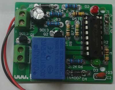 3、调试:用导线与线路板上的接线端子接好,接上电源,电源指示灯点亮,同时继电器应吸合,然后用手将低水位探头的引出线与地相连,再将高水位探头与地相连,此时断电器断开;接着将高水位探头引出线与地断开,然后再将低水位与地断开,此时继电器再次吸合,反复测试几次,如都是按上述规律变化,则说明电路工作正常。实验室试验时,可用一个一次性水杯,将水位线按高低不同放入杯内,然后往杯中加水,就可以模拟整个抽水过程。