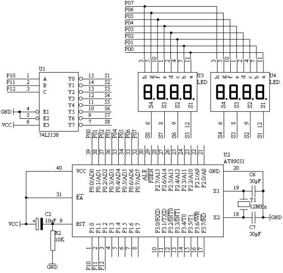 用AT89S51单片机的P0.0/AD0-P0.7/AD7端口接数码管的a-h端,8位数码管的S1-S8通过74LS138译码器的Y0-Y7来控制选通每个数码管的位选端。AT89S51单片机的P1.0-P1.2控制74LS138的A,B,C端子。在8位数码管上从右向左循环显示“12345678”。能够比较平滑地看到拉幕的效果。