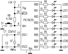 。值得注意,在PIC系列单片机中,对初级产品PIC16C54/55的复位向量为1FFH;PIC16C56为3FFH;PIC16C57/58为7FF;对中级和高级产品的复位向量为000H和0000H。由此可见在建立PIC单片机源程序时,使用一些伪指令是很有必要的,用它可以为建立源程序完成一些特定功能,使编制的源程序大大简化。源程序后面的各条指令功能均已在注释中给了说明,这里不再复述。